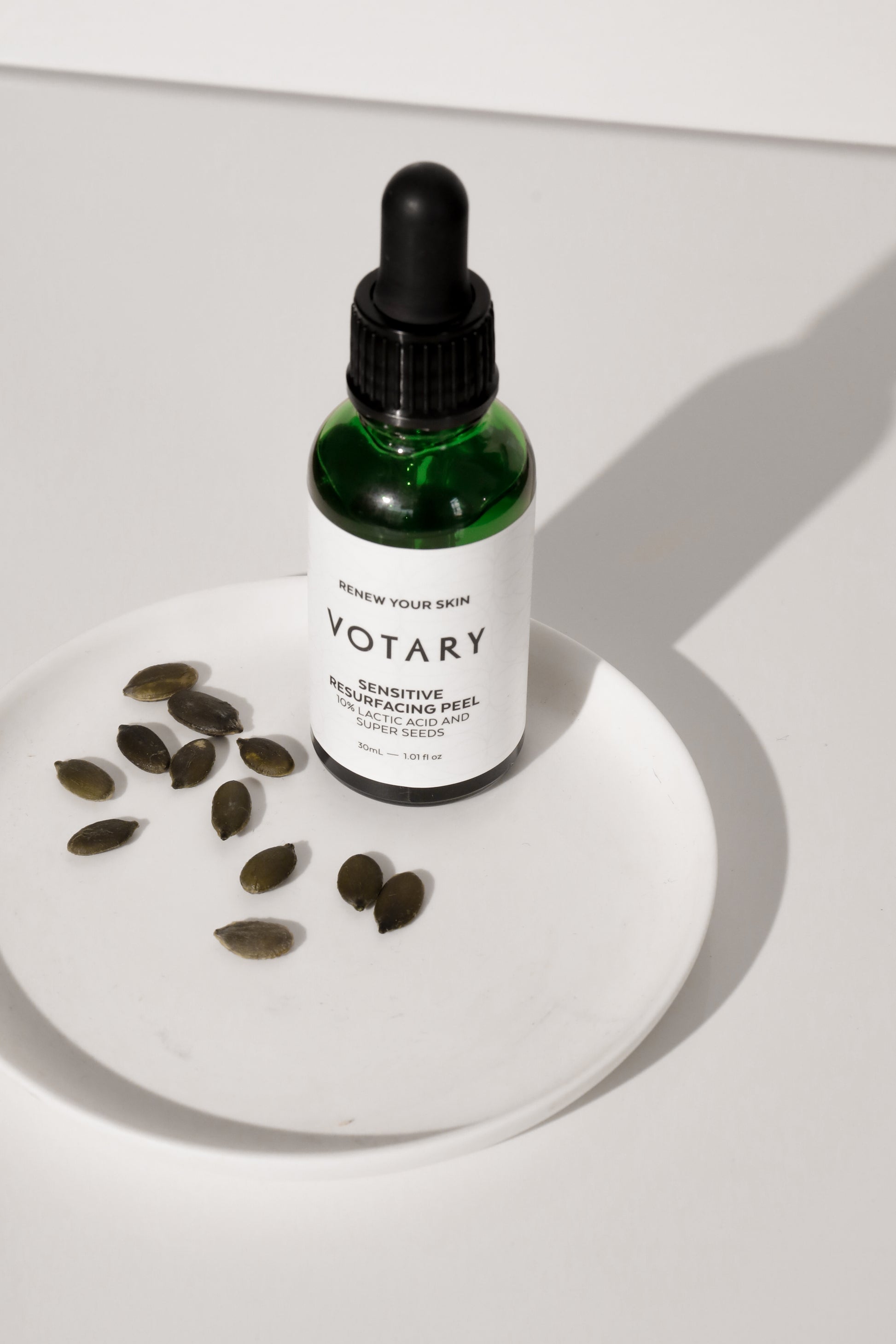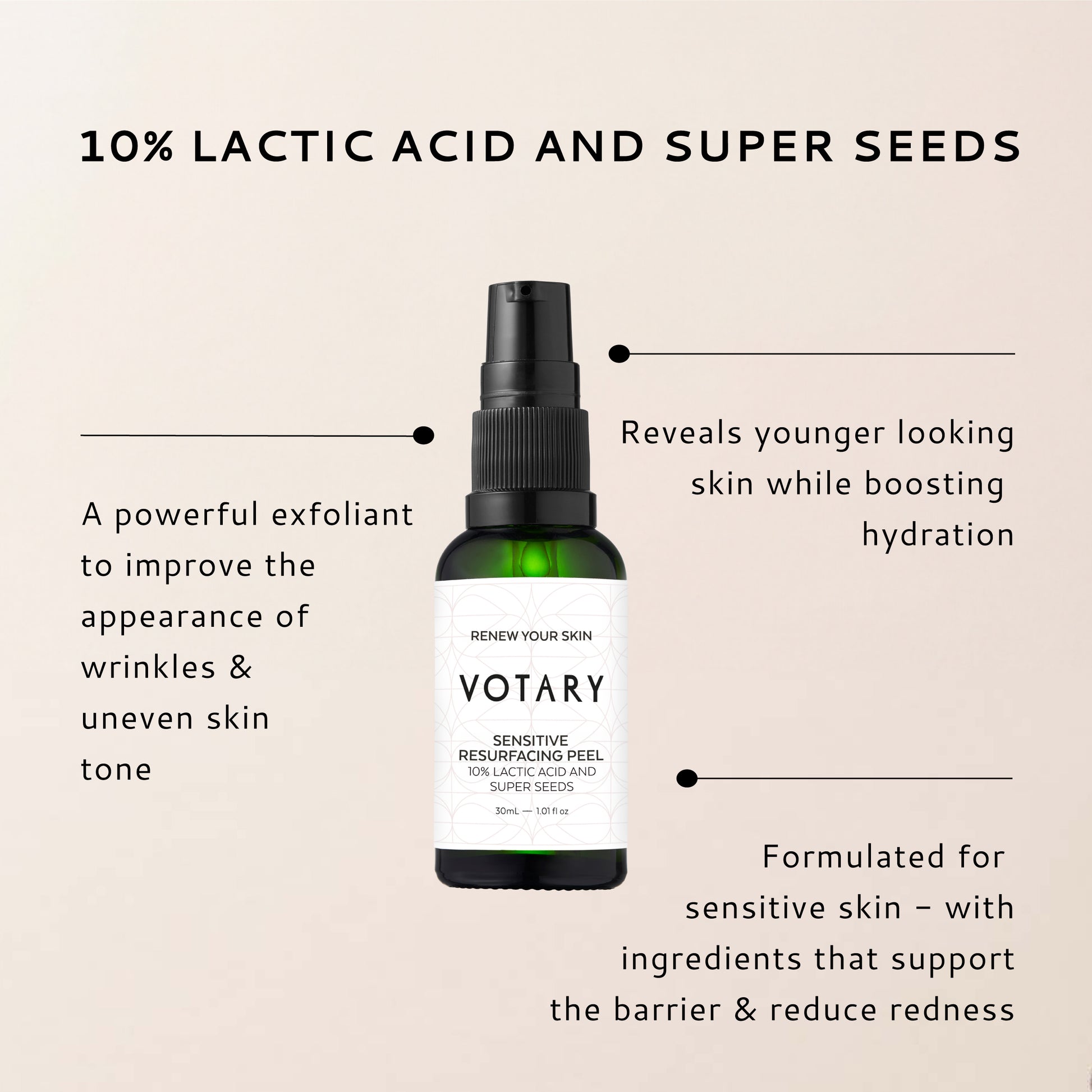 Formlen kombinerer 10 % mælkesyre – den højeste koncentration tilladt under EU-regulativer – med de beroligende egenskaber fra VOTARYs Super Seed-ekstrakter.